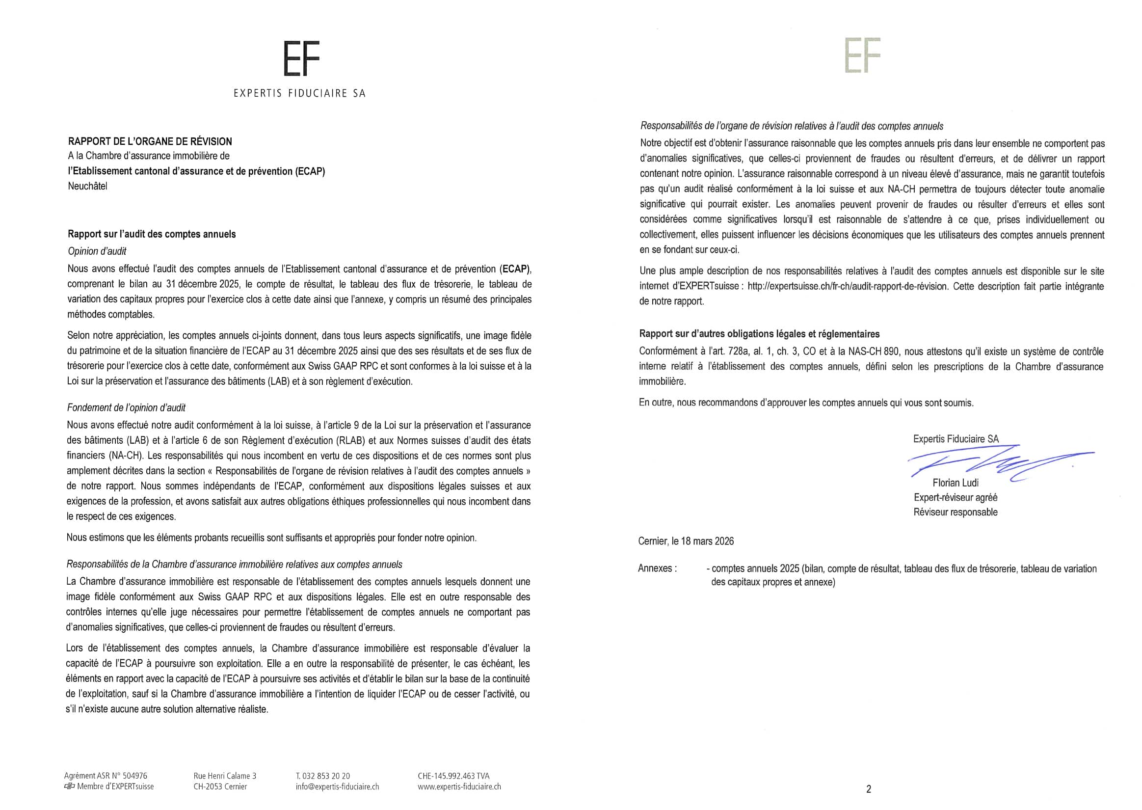 Tout en consolidant la solidité financière de l’ECAP, le résultat 2025 a également permis le versement de 2,5 millions de francs sous forme de rabais de prime, prouvant ainsi que l’efficacité du modèle des ECA profite directement aux propriétaires neuchâtelois.